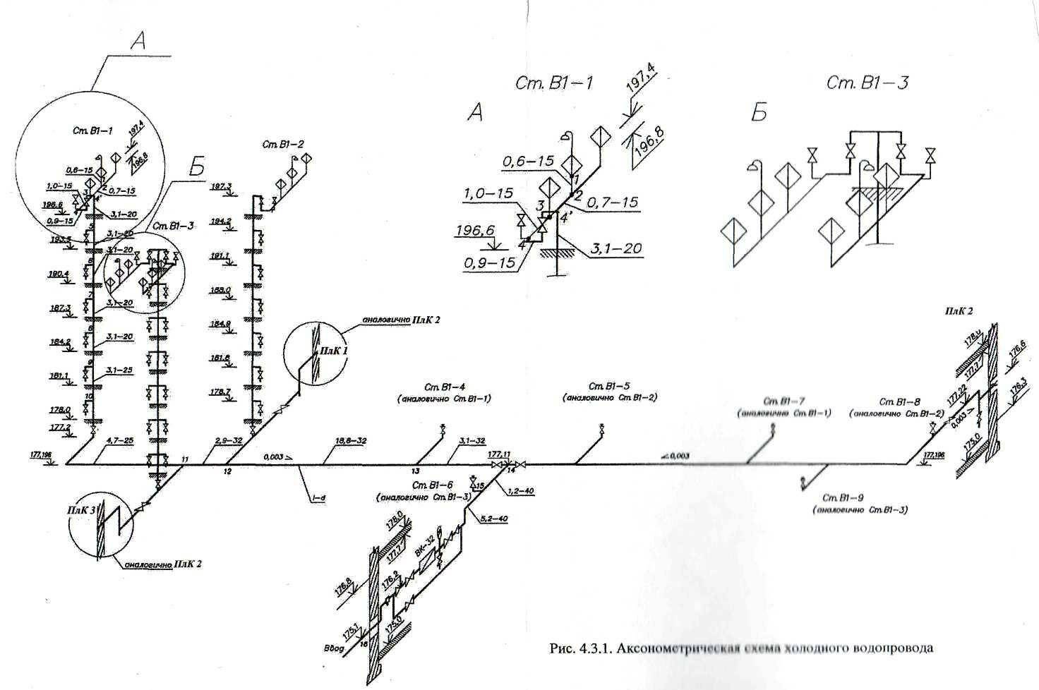 Стояк, который находится на максимальном удалении от ввода в дом, наносится полностью. Другие элементы изображаются частично, с указанием их марки. Вертикальная прорисовка стояка позволяет изобразить особенности установленной на него запорной арматуры.