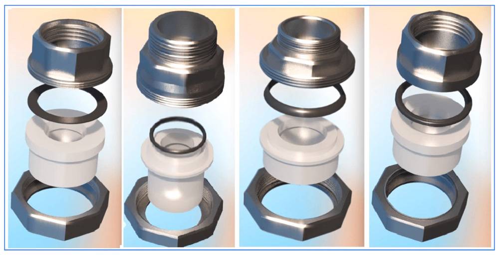 Две из них являются ответными торцами с нарезанной внутренней или внешней резьбой. Третья это накидная гайка, предназначенная для соединения первых двух частей между собой.