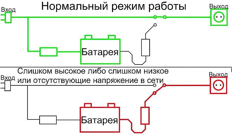 Внутри агрегата находится датчик, который при нехватке напряжения отключает питание от сети и задействует внутренние ресурсы. В среднем, его возможностей хватит на промежуток от нескольких минут до двух часов.