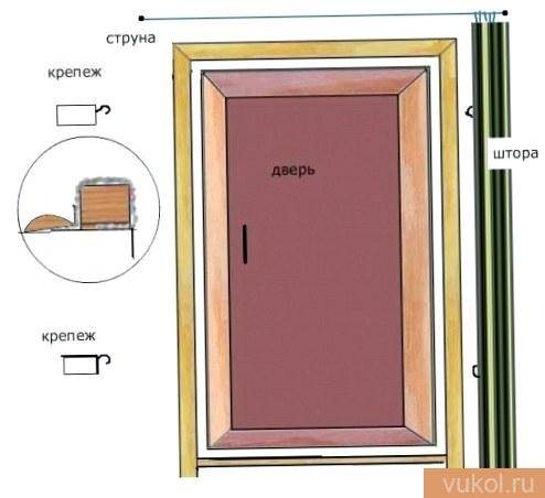 - Над проемом натягивается леска или устанавливается труба, в которую продеваются кольца на шторке;
