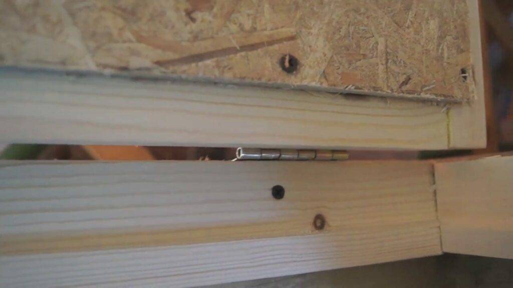 Дверца лаза готова, теперь её необходимо прикрепить к рамке с помощью петель. Лаз будет гораздо удобнее открываться, если его дверцу снабдить ручкой и защёлкой.