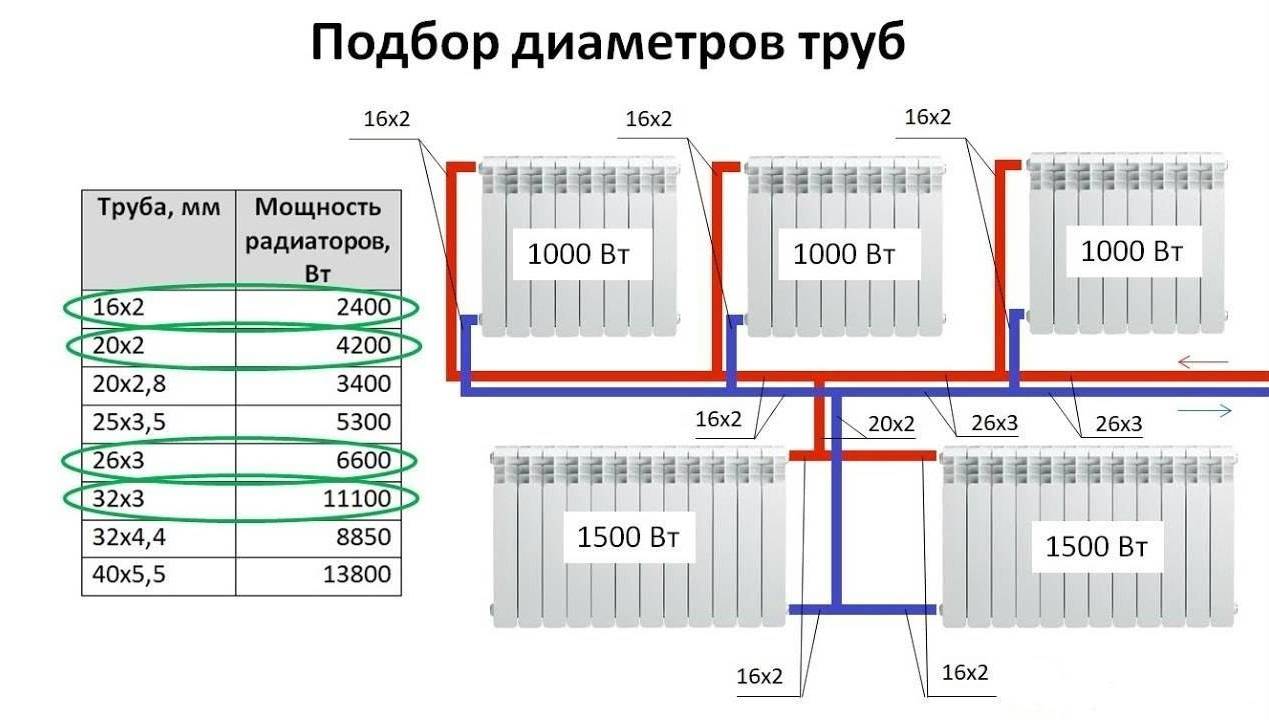 Для расчета нужно узнать мощность каждого теплового прибора. Для этого показатели одной секции умножаются на количество. В местах, где сделана подводка к нескольким отопительным приборам, мощность суммируется. Для присоединения к котлу используются элементы размером 32 или 25 мм – котлы для двухконтурной схемы чаще имеют патрубки таких габаритов.