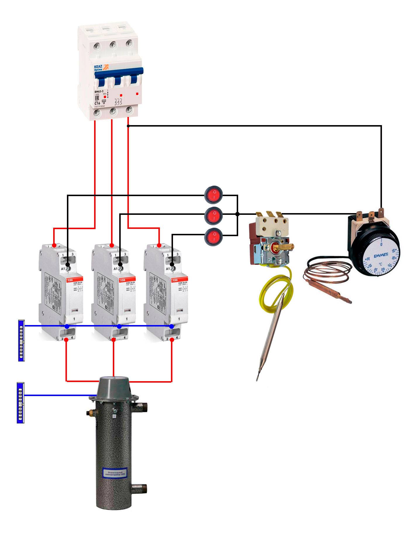 Таким образом мы получили элемент защиты и элемент управления. В принципе, это и есть самая примитивная схема №1 для автоматики электрического отопления.