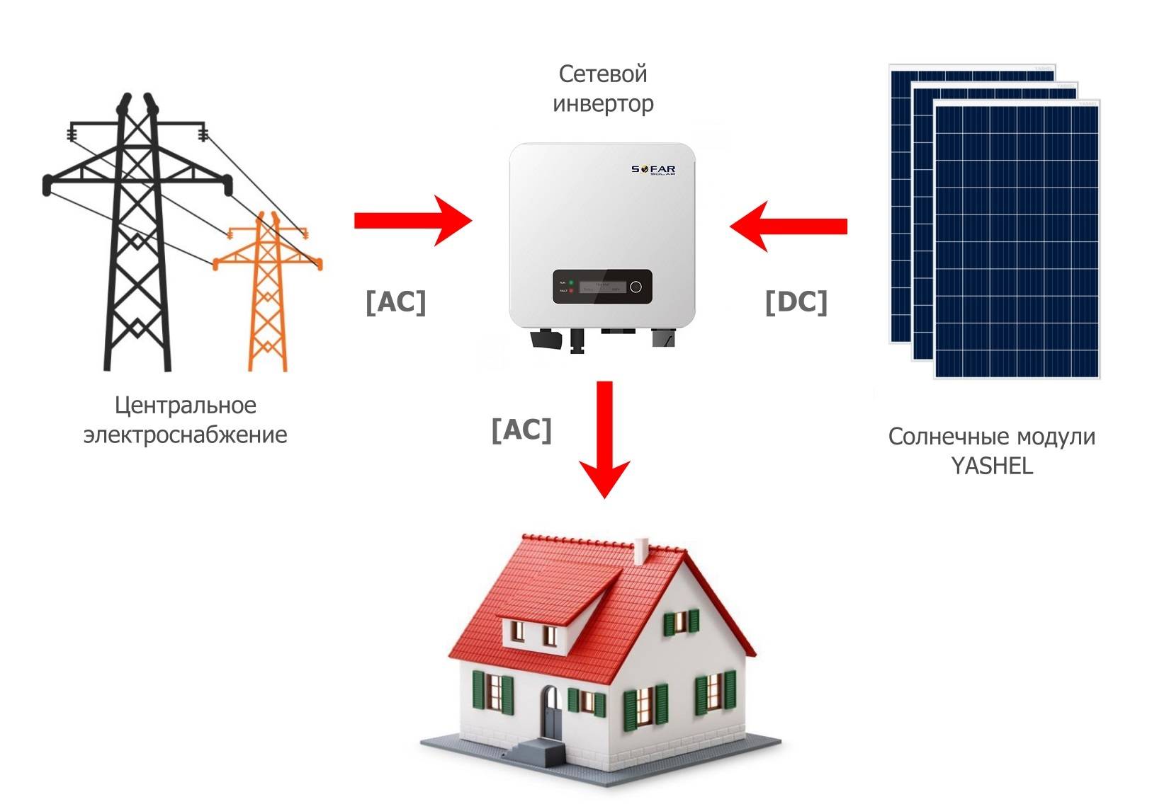 Сетевой инвертор для солнечных батарей работает совместно с централизованным электроснабжением. Помимо преобразования энергии в задачи таких установок входит контроль за напряжением и частотой тока внешней сети. Также они передают лишнее электричество в основную электросеть. Кстати, владелец фитоэлектростанции может неплохо на этом заработать, продавая излишки энергии частным компаниям.