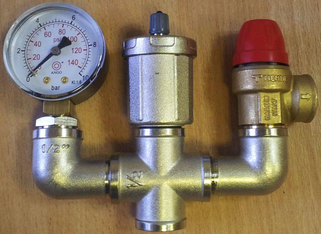 Любая группа безопасности для отопления состоит из трёх элементов, установленных на одном вводном штуцере (консоли). Смотрим слева направо: манометр (датчик давления); устройство отвода избыточного воздуха, клапан аварийного сброса (предохранительный клапан). На более дорогих моделях ставятся дополнительные элементы – измерители температуры и смесительный узел.