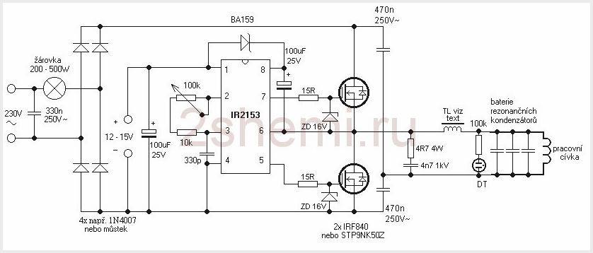 Чтоб удобнее настраивать резонанс можно собрать более совершенную схему с драйвером IR2153. Рабочая частота настраивается регулятором 100к в резонанс. Частотами можно управлять в диапазоне примерно 20 — 200 кГц. Схема управления нуждается в вспомогательном напряжении 12-15 В от сетевого адаптера, а силовая часть через диодный мост может быть подключена напрямую к сети 220 В. Дроссель имеет около 20 витков 1,5 мм на ферритовом сердечнике 8?10 мм.