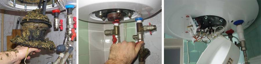 При чистке накопительного водонагревателя следует заняться ТЭНом и стенками бака. Дело усугубляется тем, что не существует нормального отверстия ремонтнику провести сервисные операции, упрощается тем, что ТЭН легко или сложно вынимается наружу, соли анода больше напоминают слизь, нежели каменный карбонат кальция