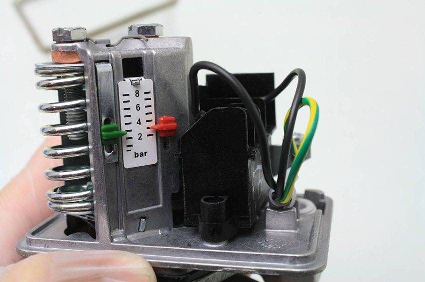 Конструкция всех моделей одинаковая, а форма, размер и дополнительные элементы, например, встроенный манометр, являются их характерными особенностями. Под пластиковой крышкой на металлическом основании установлены два регулятора в виде пружин разных размеров и клеммы, чтобы подключить прибор к электросети и насосному оборудованию (вдобавок иногда предусматривается заземление).