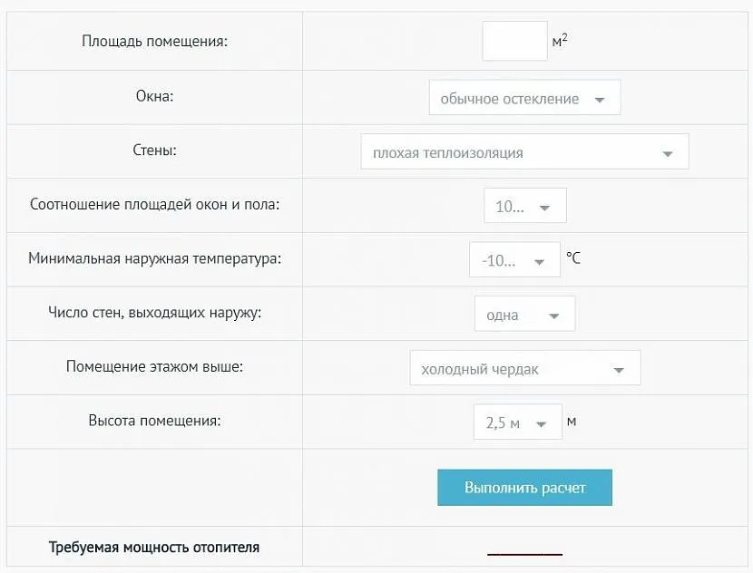 Как правило, сервис по расчету требует заполнить все поля, что поможет наиболее точно сделать расчеты, включающие мощность прибора и теплоизоляцию дома.
