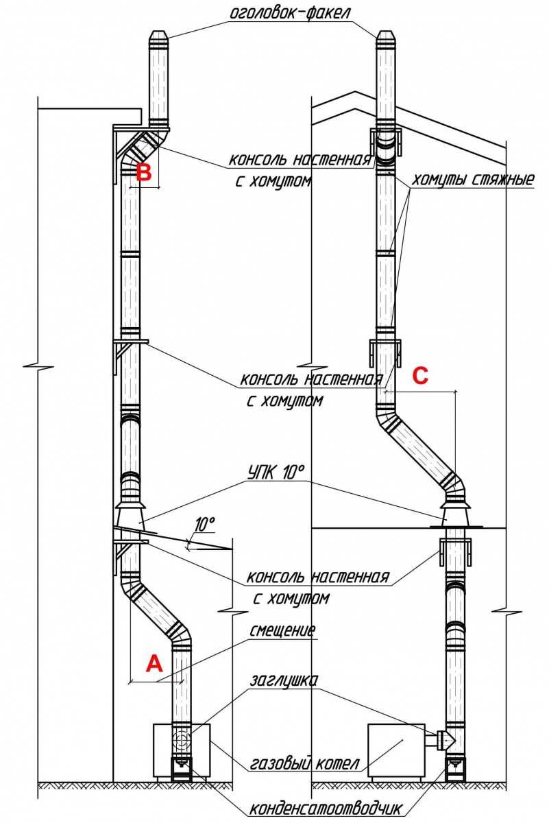 На данном рисунке можно рассмотреть все части дымоотводной конструкции, которая состоит из следующих элементов и отделов: