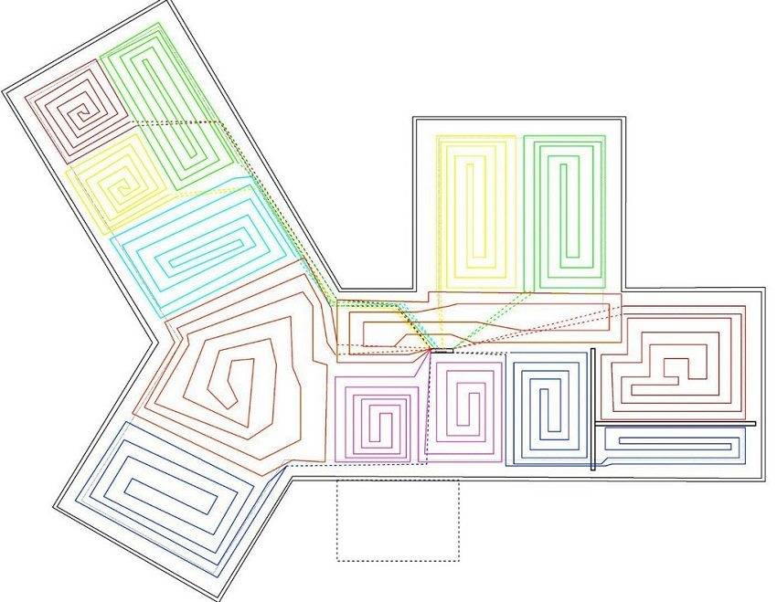 Пример схемы разводки теплого водяного пола по секторам