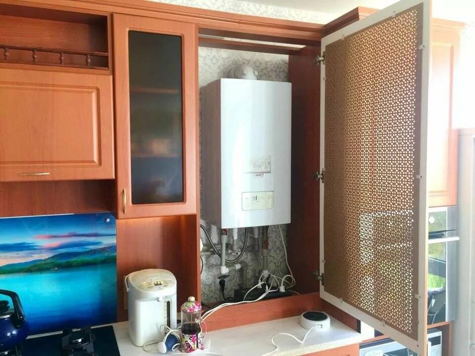 Но если дизайн кухни позволяет, отдайте предпочтение решетчатым дверцам — воздух будет свободно циркулировать, не сможет повлиять на работу котла.