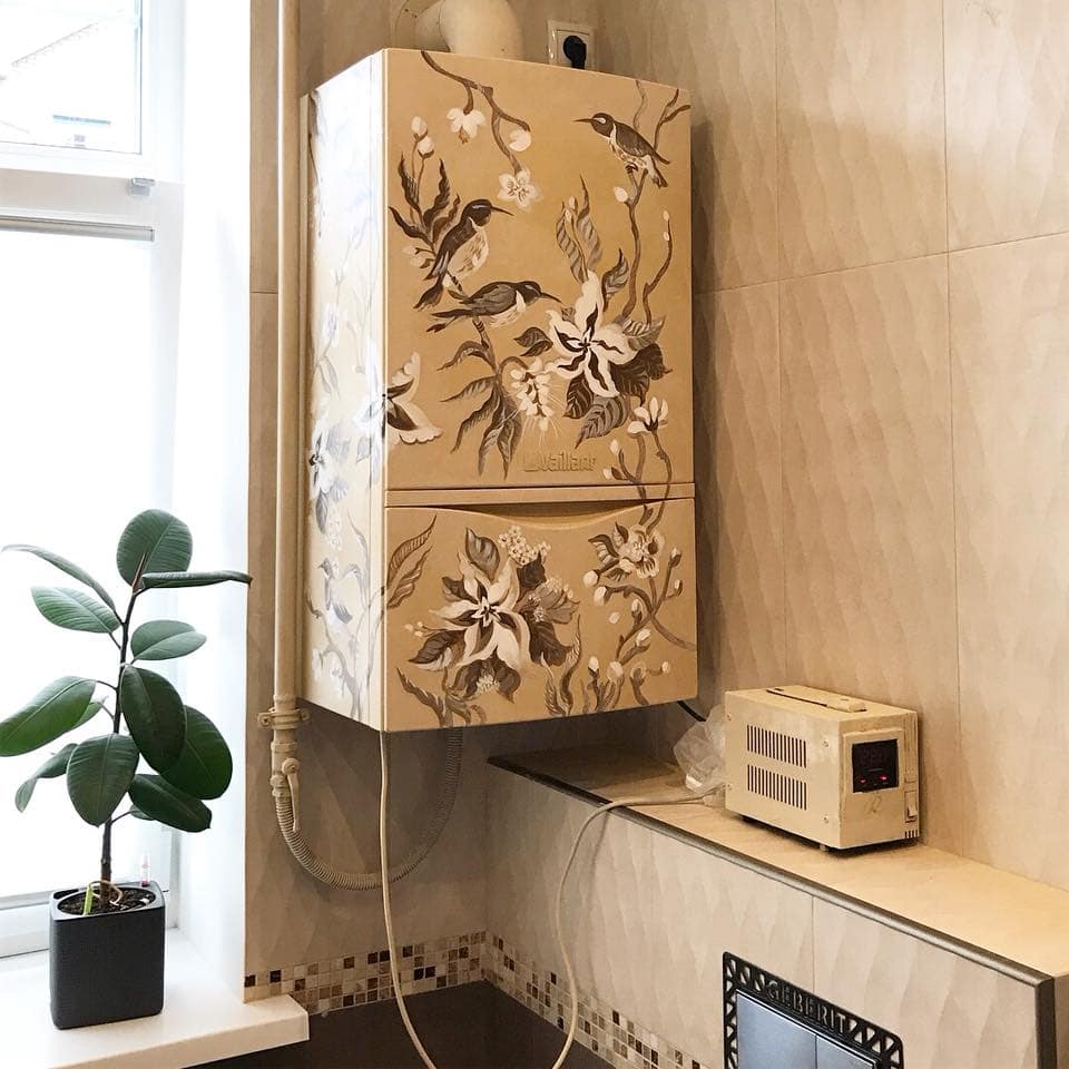 Обычную газовую колонку можно превратить в настоящее произведение искусства, изюминку интерьера. Ее необязательно красить в один цвет – можно нанести рисунок по трафарету или собственному наброску. Еще интереснее будет смотреться кухня, в которой такой рисунок повторяется в декоре стен, текстиля, штор, мебели.