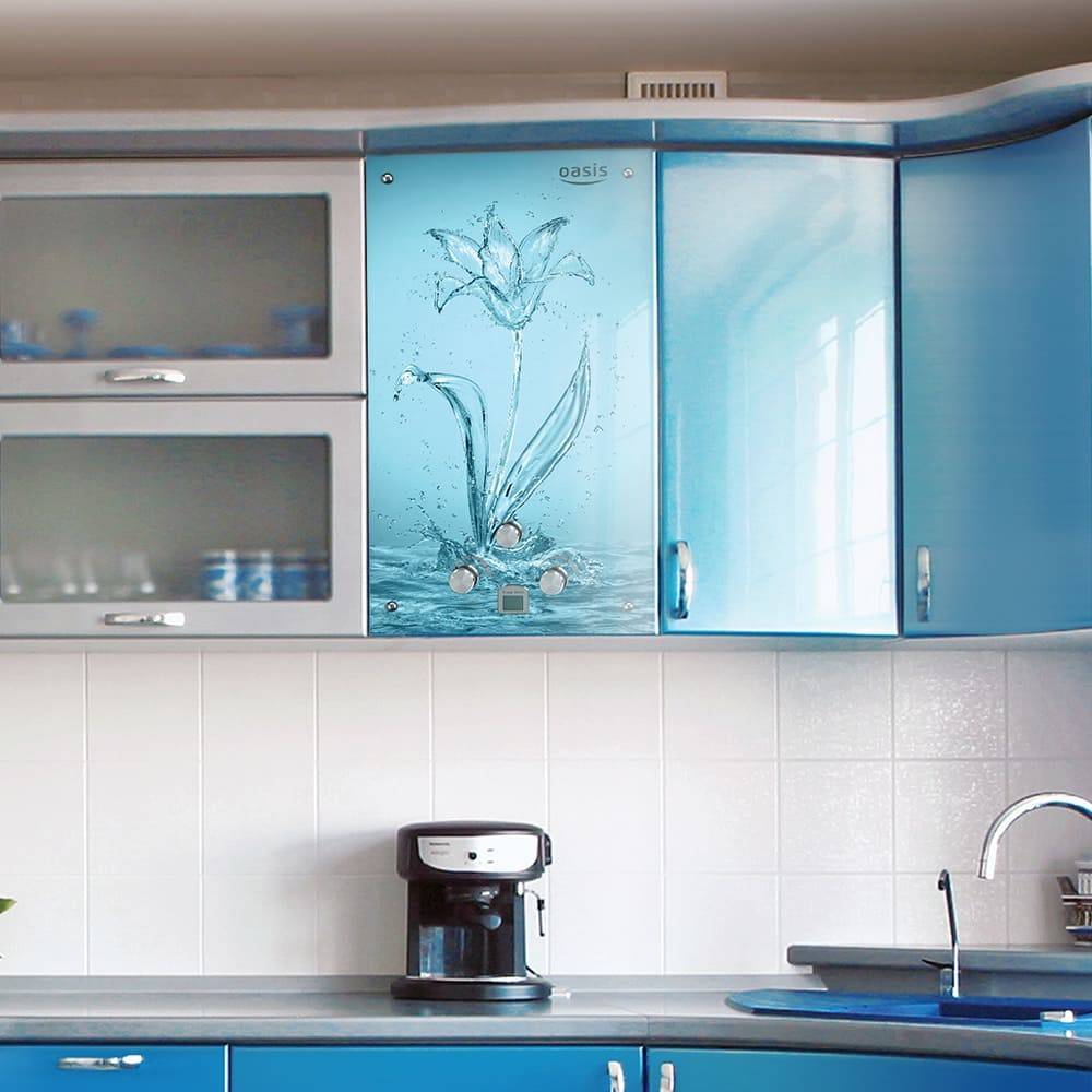 Прибор можно повесить между двумя шкафами на кухне и оставить его неприкрытым. Такой вариант отлично подойдет для новых, стильных нагревателей, которые сами по себе красиво смотрятся в интерьере.