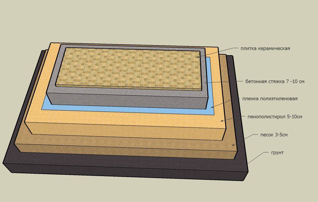 - Бетонный пол. Если основой для бани служит железобетонная плита, то задача значительно упрощается. Такая основа прочна и стабильна. Ее можно покрыть кафелем. В качестве утеплителя можно использовать листы пенопласта или керамзит. Устройство теплого пола решит вопрос не только утепления, но и отопления. Кафель следует выбирать с рифленой поверхностью, чтобы на ней не поскользнуться.