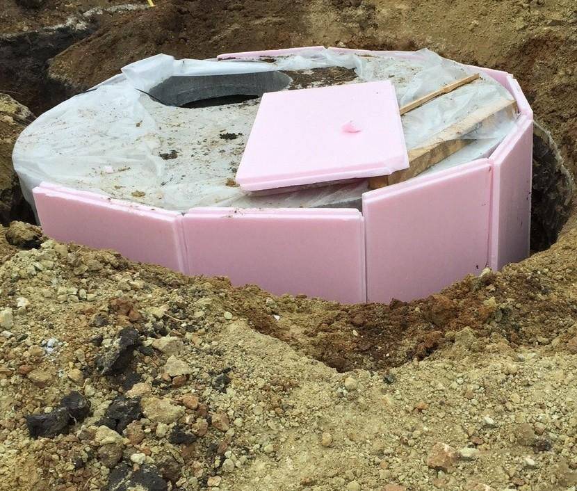 Если кольца уже установлены, их придется откопать. Яму роют на 50 см глубже уровня промерзания грунта. Бетонные стенки зачищают от грязи, грунтуют, покрывают гидроизоляцией. Сверху крепят утеплитель. Здесь выбор небольшой: пенополиуретан или Пеноплэкс. В первом случае получается монолитная оболочка. При использовании Пеноплэкса плиты приклеивают пеной к бетонной поверхности, обвязывают по кругу проволокой. Стыки задувают пеной. Сверху Пеноплэкс можно ничем не закрывать или для надежности обмотать слоем гидроизоляционного материала. Вырытый котлован обратно засыпают землей.