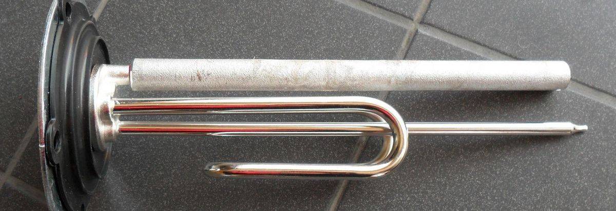 Анод — сменная часть. Принцип работы основан на том, что деталь постепенно разрушается ионами, накипь не оседает на ТЭНе, а выпадает в осадок.