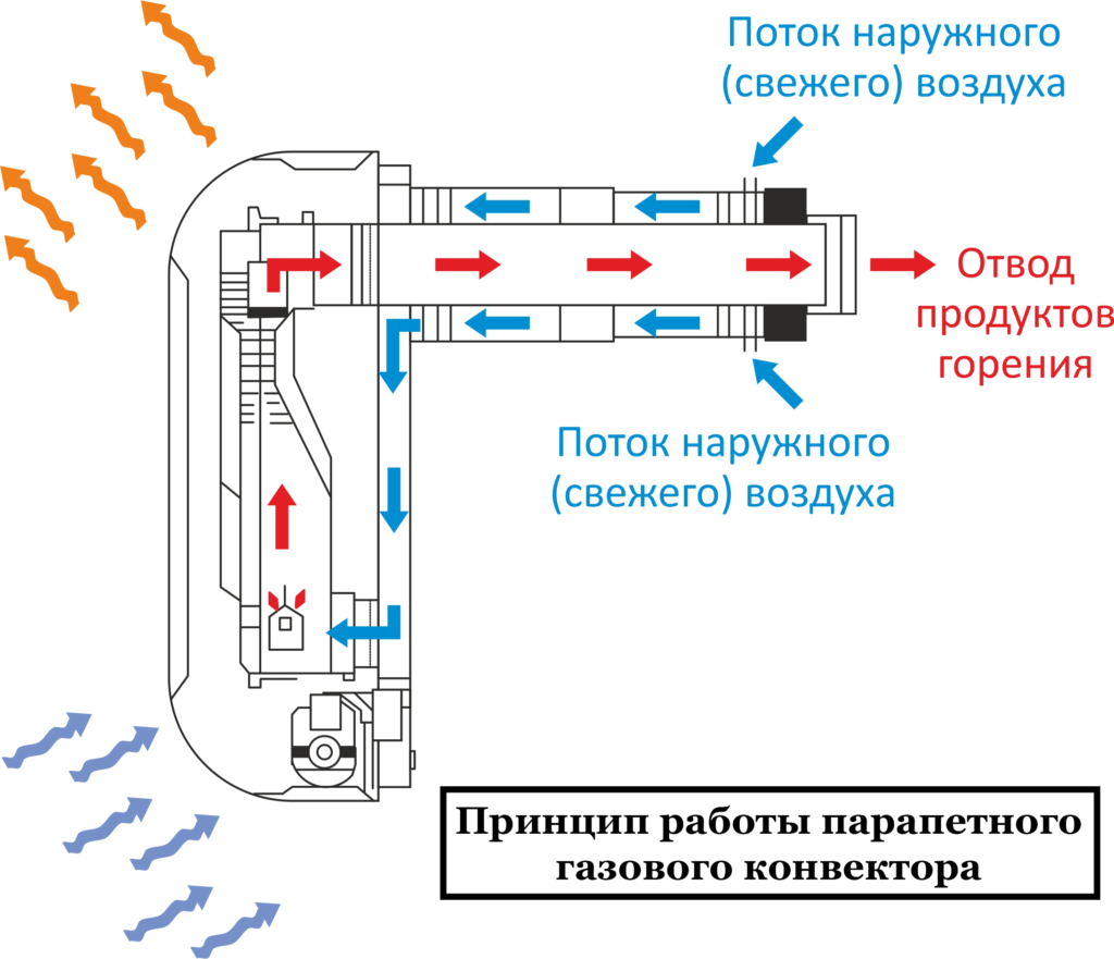 - Парапетные обогреватели более экологичны и безопасны. Забор воздуха и отвод дымовых газов в них производится через коаксиальную трубу, которую прокладывают через наружную стену на улицу. Тяга в этом случае поддерживается встроенным вентилятором.