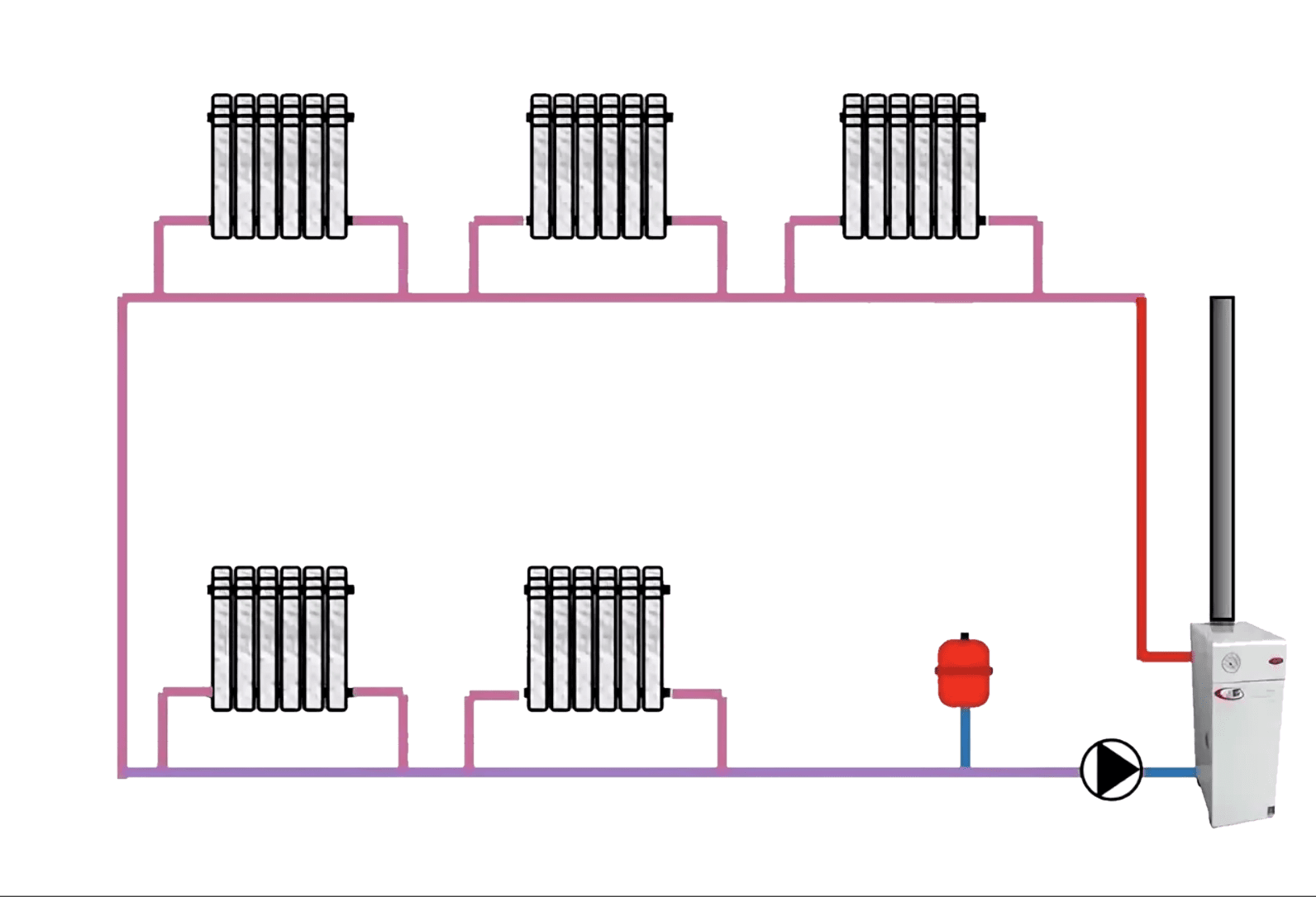 В такой схеме радиаторы подключены друг за другом вдоль одной отопительной магистрали. Теплоноситель проходит последовательно через каждый из них и возвращается обратно в котел.