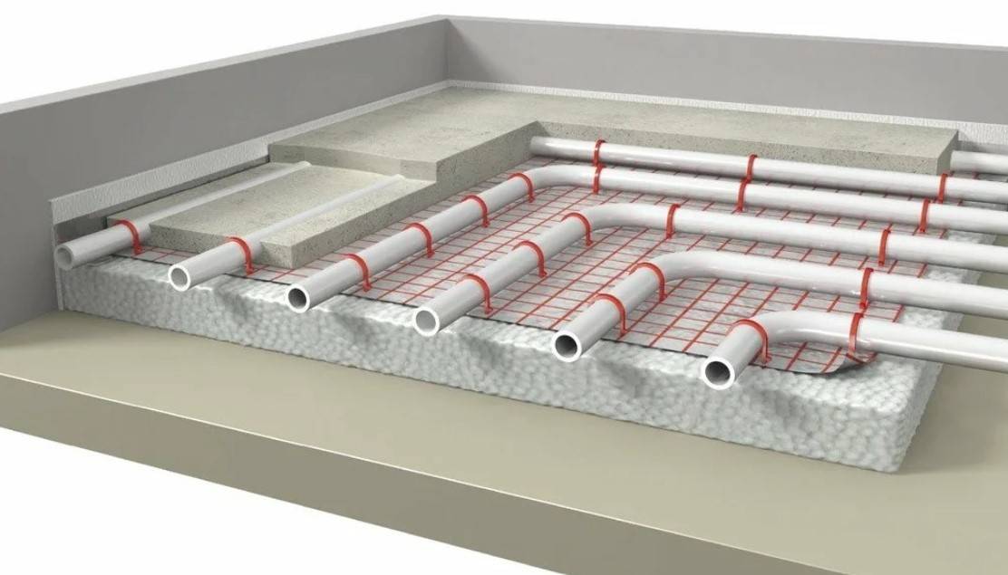 Устанавливается из труб, которые помещаются в специальную стяжку. Смонтированные трубы подключаются к системе отопления.