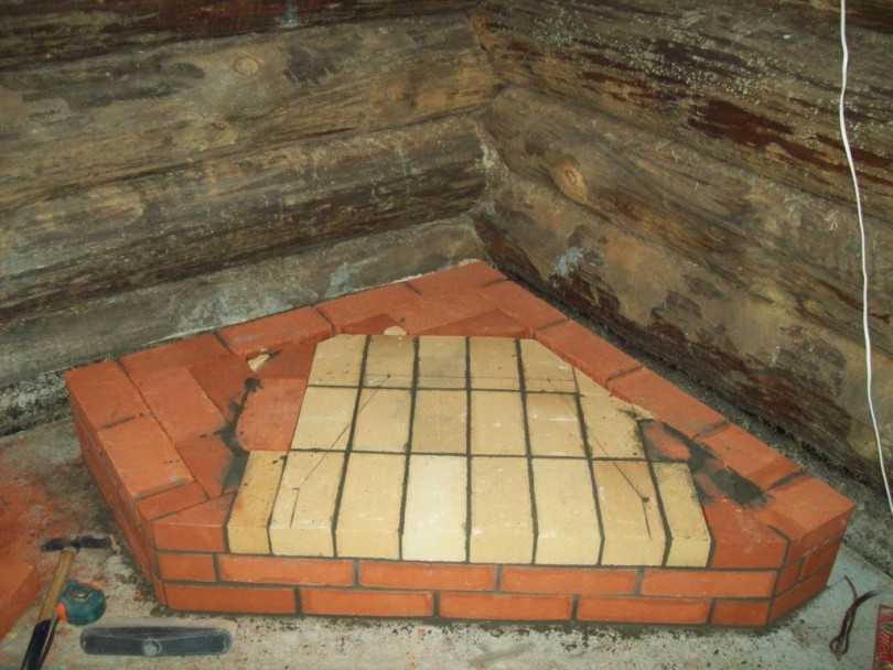- Выложить керамическим кирпичом основание камина, состоящее из 2 рядов;