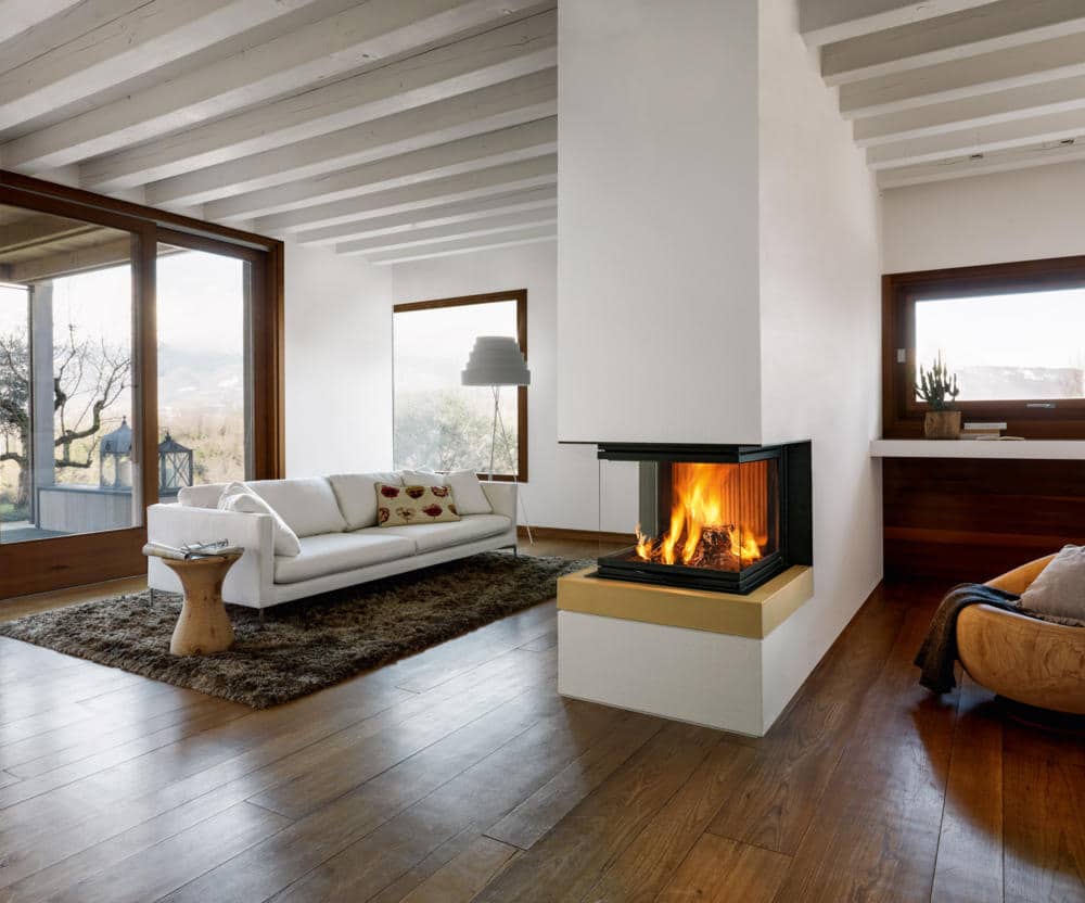 Возможна комбинация перечисленных модификаций, с размещением в углу оборудования пристенного типа. Установка отопительных агрегатов в углу экономит пространство помещения, что особенно актуально при небольших размерах комнат. Огонь в топке доступен к обозрению из любой точки.