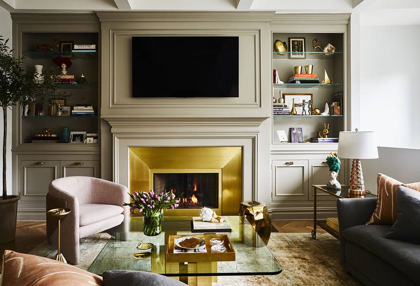 Ваша семья предпочитает заниматься своими делами, а не общаться вечерами? Тогда поставьте у камина только кресла и повесьте телевизор на противоположной стене, чтобы его было видно, но чтобы огонь не отбрасывал блики в экран. Нельзя вешать телевизор прямо над настоящим камином.