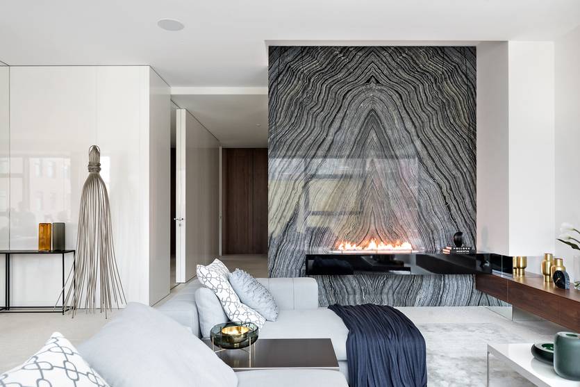камин в интерьере современной гостиной
