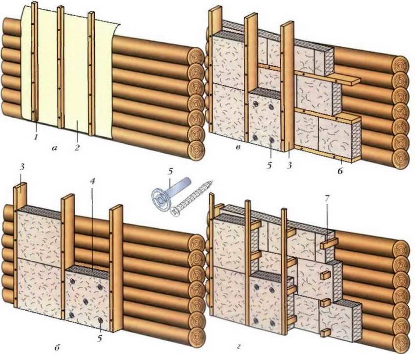 Утепление стен: а — рулонный утеплитель, б — межкаркасное в один слой, в — межкаркасное в два слоя, г — бескаркасное в два слоя; 1 — обрешетка, 2 — рулонный утеплитель, 3 — вертикальный каркас, 4 — плитный утеплитель, 5 — грибок, 6 — горизонтальный каркас, 7 — коротыши