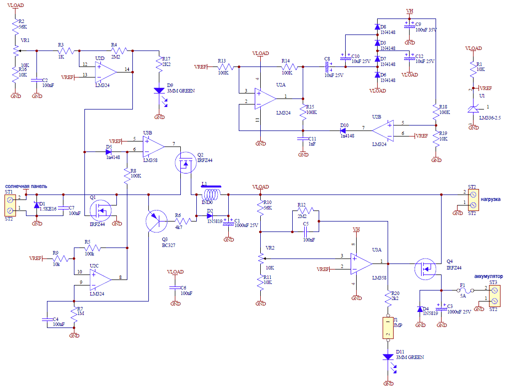 В данной схеме использовано 8 резисторов в качестве нагрузки для утилизации энергии. Эта схема является первоначальной, ее можно упростить самостоятельно, а можно прибегнуть к помощи достоверных источников. Несмотря на очевидную простоту конструкции, не рекомендуется использовать контроллеры, созданные своими руками, во избежание неблагоприятных последствий, таких как порча АКБ, например (при напряжениях 36–48 вольт).