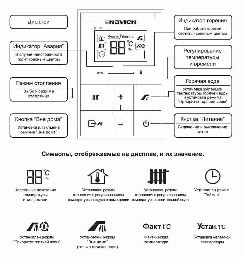 - Котлы Навьен ломаются чрезвычайно редко. При появлении на дисплее ошибок нужно сразу же проверить соответствующие датчики,соединительные провода. В 85% случаев причина именно в них или во внешних факторах (несоответствие параметров домовых систем; например, давления в магистрали).