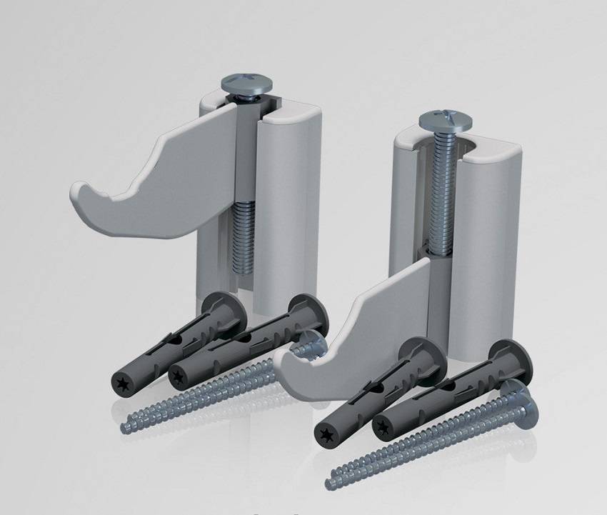 Существуют и особые планки для упрощенного монтажа. Это металлические полосы, имеющие снизу и сверху пластиковые фиксаторы. При таком способе фиксации скобы на радиаторе не нужны. Полосы прикручиваются к стенке, в них вставляется батарея, удерживаемая крюками из пластика.