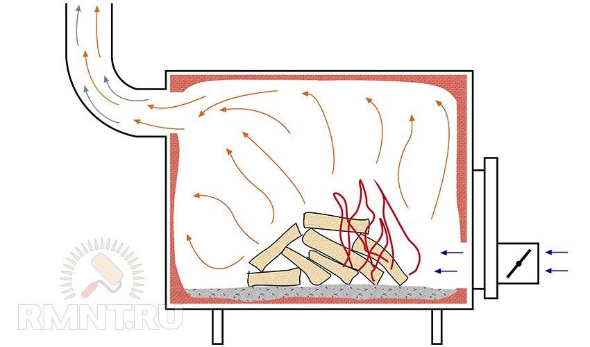 Конструкция. Стальная топка любой формы — куб, параллелепипед, горизонтальный или вертикальный цилиндр — с дверцей типа «Булерьян» в передней нижней части и дымоходом в задней верхней.