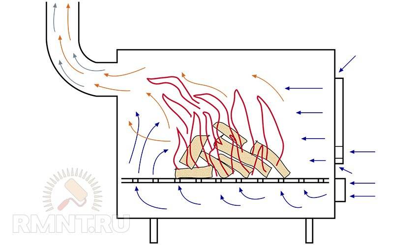 Без решётки кислород проходит только через приточный канал, который довольно точно регулируется. В результате увеличивается время горения и продукты лучше разлагаются. При этом горячий газ дольше задерживается в топке и эффективнее прогревает стенки. В результате больше тепла остаётся внутри помещения.