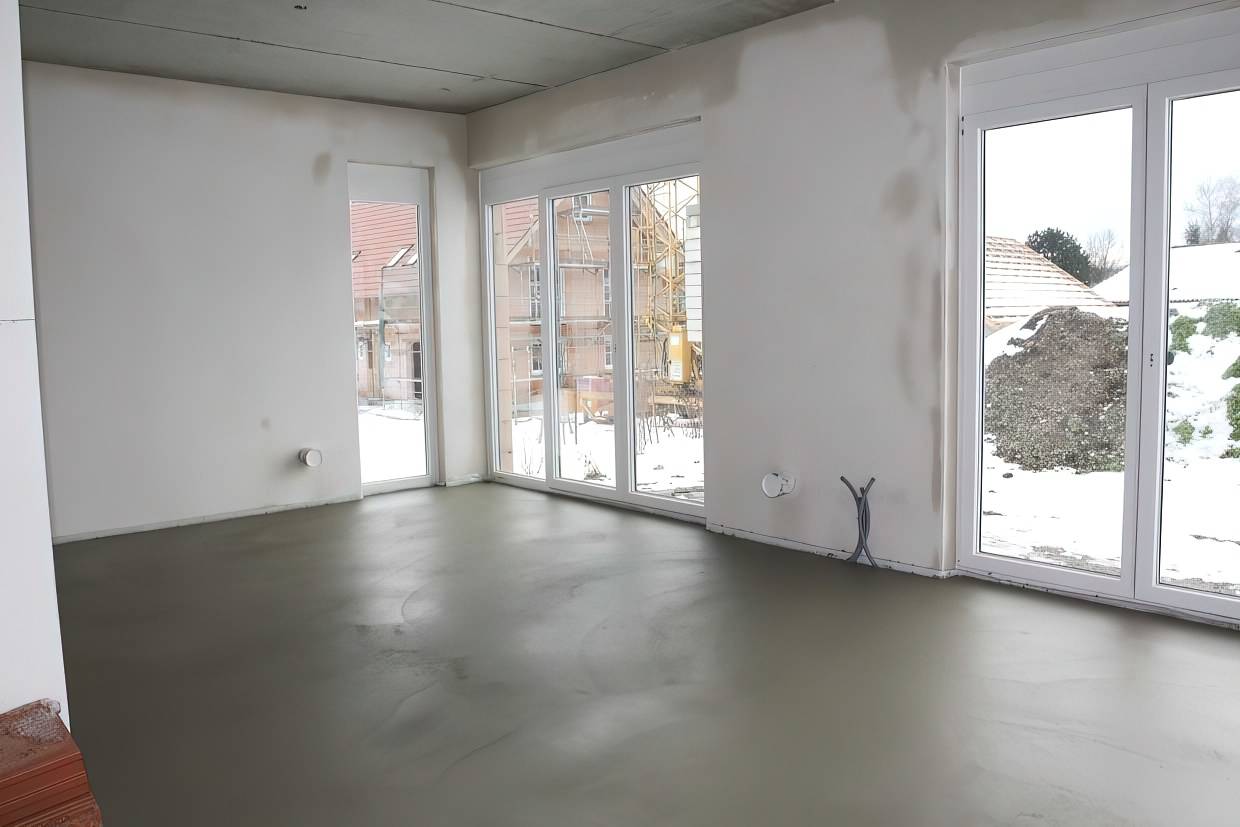 - Раствор готов, можно заливать основание. Работу начинают с дальнего угла и постепенно, разравнивая поверхность правилом по маякам, доходят до дверного проема.