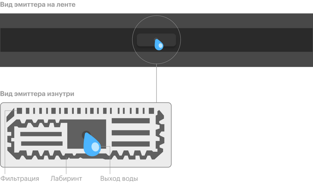 - Эммитерные. Более надежные и дорогостоящие, чем щелевые. Обеспечивают стабильную подачу воды, не склонны к засорению.