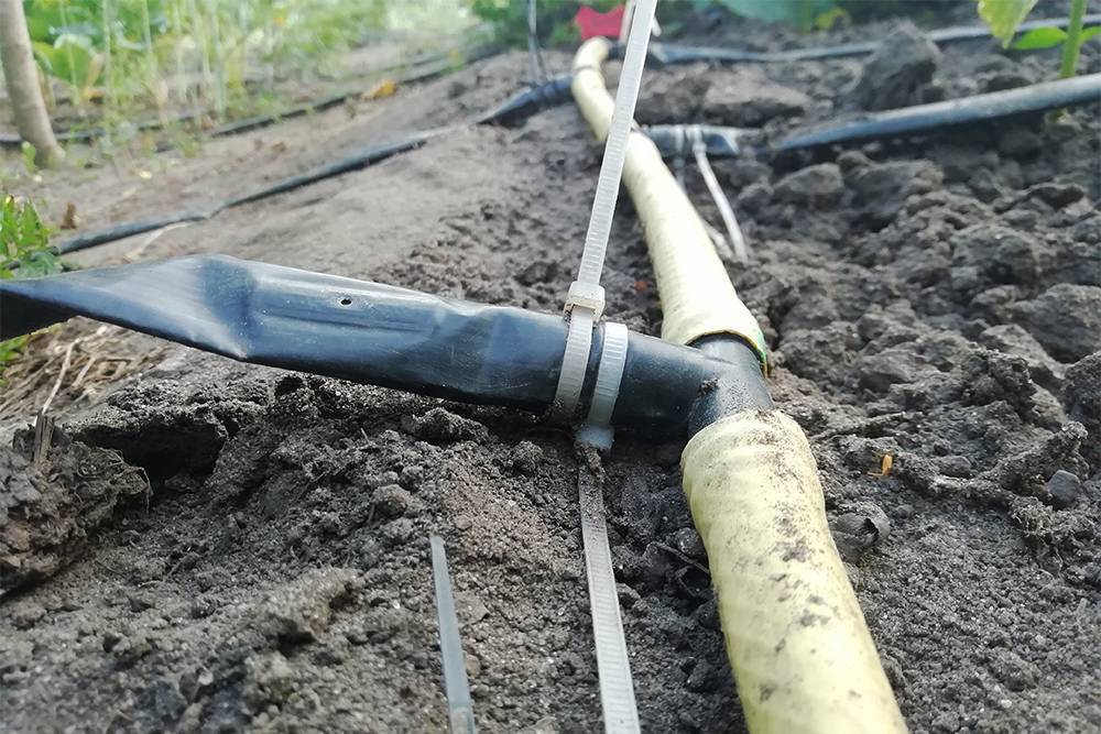 Но в магазинах я не нашла такой трубы, а заказывать ее было дорого. Поэтому в качестве магистрали я использовала самый обычный и самый дешевый поливочный шланг диаметром ½ дюйма — покупала его еще в 2013 году примерно за тысячу рублей. Я разрезала его на кусочки, между которыми вставила Т-образные фитинги. На верхний и нижний конец я закрепила магистральный шланг, а на боковой отвод — капельную ленту. Крепила обычными пластиковыми стяжками.