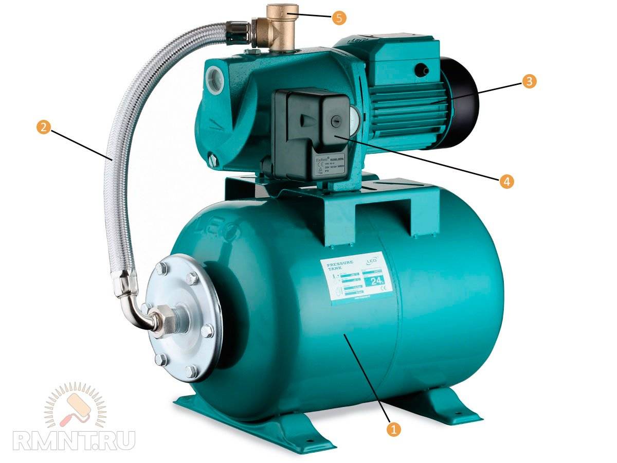 1 — гидрофора; 2 — гибкий шланг; 3 — насос с электроприводом; 4 — реле давления; 5 — ввод для водопровода