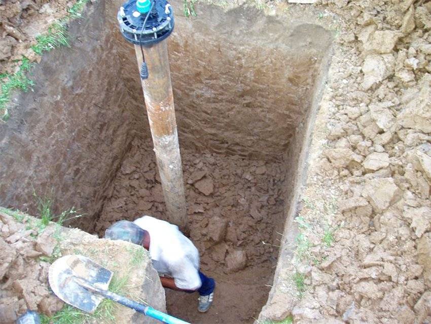 - Сначала роют котлован вокруг скважины. Размеры ямы в поперечнике должны быть на 40–60 см больше диаметра кессонного бака, а глубина такой, чтобы после установки кессона его верх выступал над землей на 15 см. Это будет защищать от попадания в камеру талых и дождевых вод. Располагают котлован таким образом, чтоб верхнее отверстие обсадной трубы проходило не по центру, а было немного сдвинуто к краю. Это необходимо для удобного расположения оборудования.