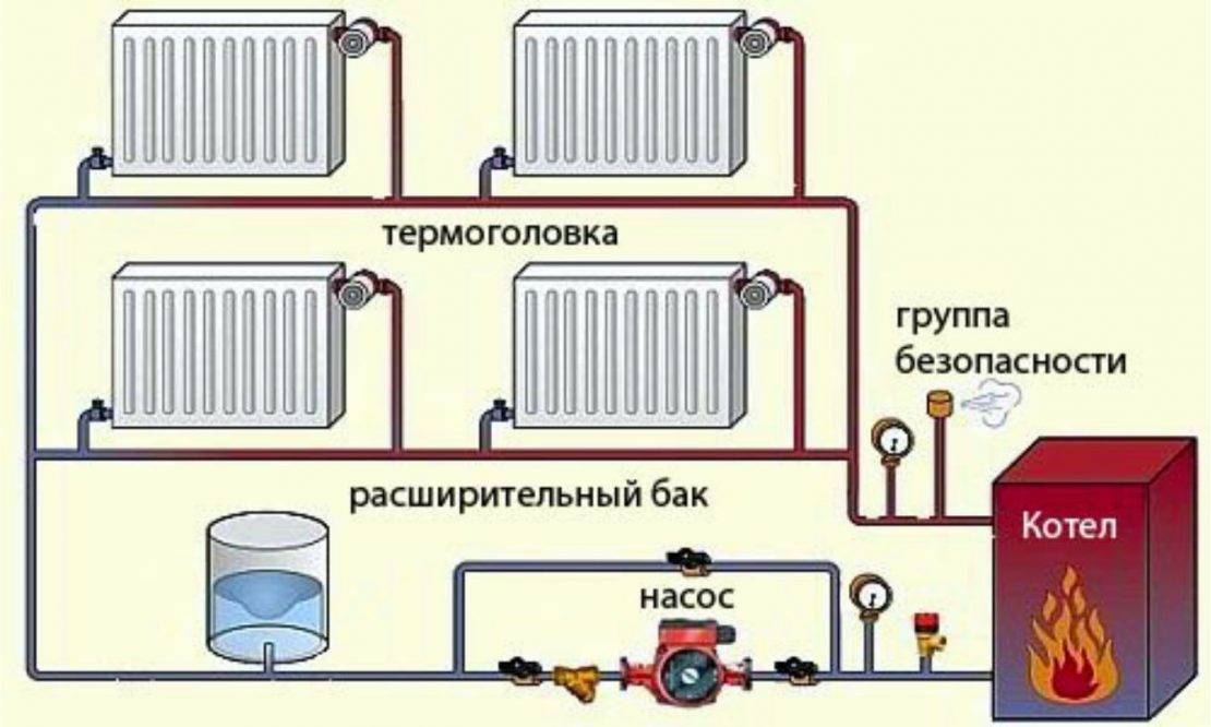 Схема системы отопления закрытого типа с принудительной циркуляцией