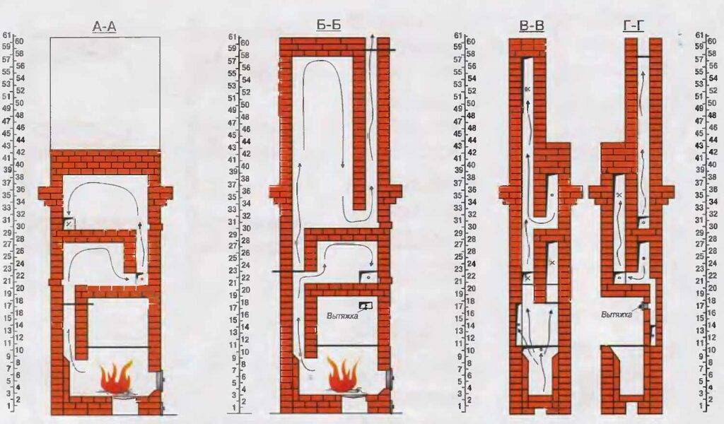 Порядовка кладки печи: продольные (А-А, Б-Б) и поперечные (В-В, Г-Г) разрезы.