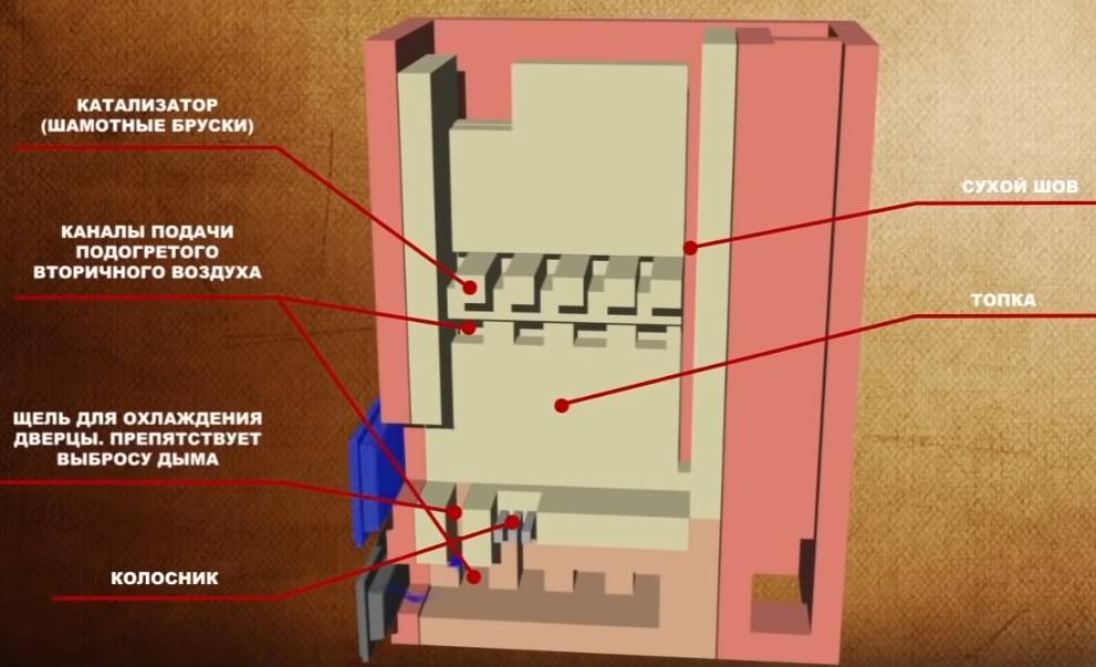 - между задней стенкой топки и ее боковыми стенками имеется зазор (2-3 см), называемый сухим швом. Он обеспечивает сепарацию дымовых газов — самые горячие поднимаются в колпак, а более холодные выводятся в сухой шов и сразу поступают в дымоход;