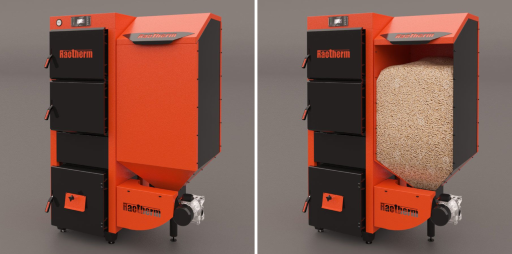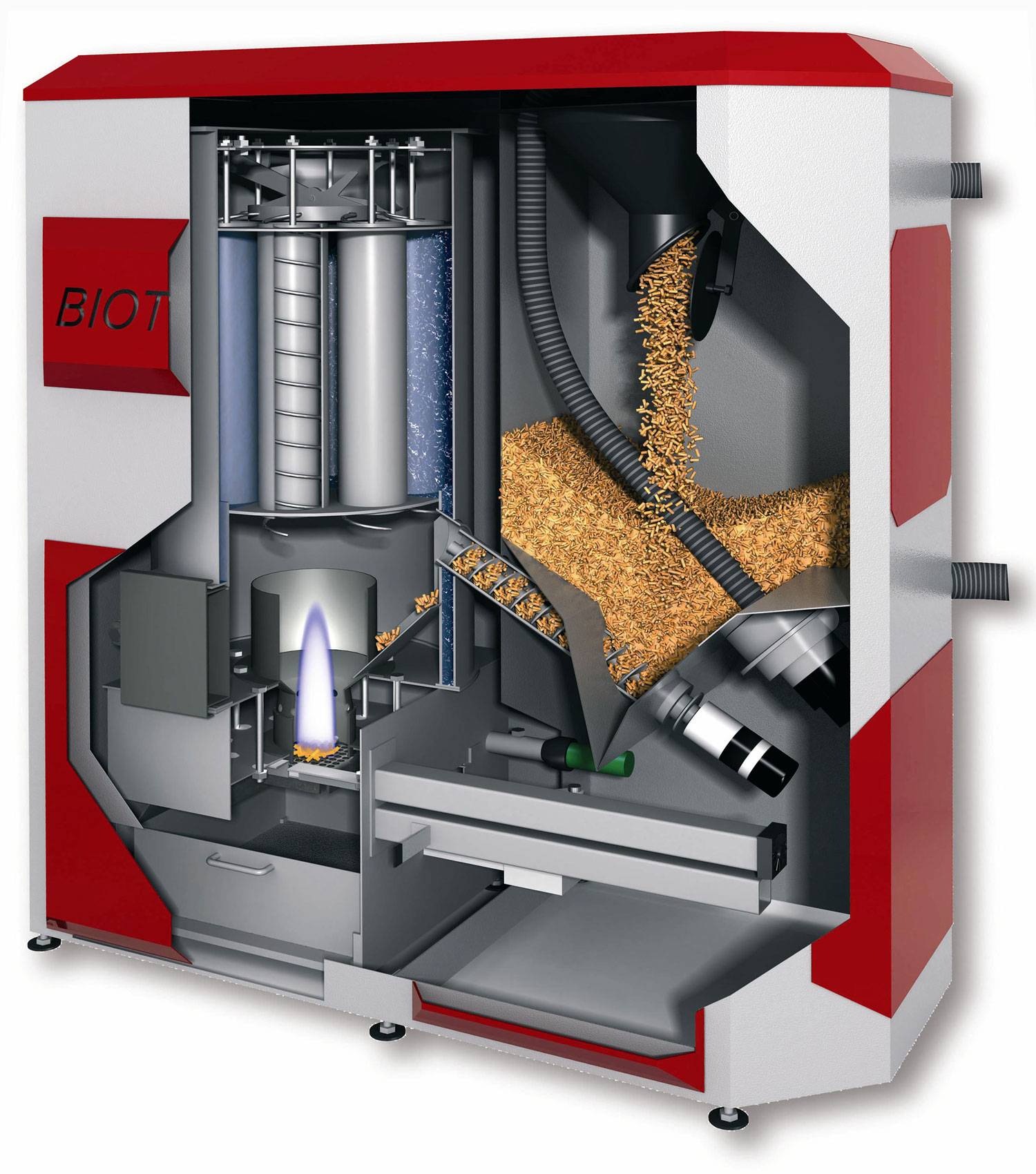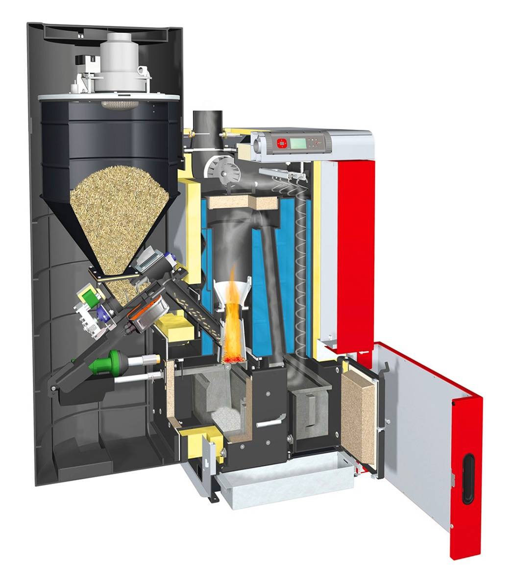Само устройство состоит из бункера для топлива, горелки, теплообменника, топки и дымохода. Оборудование оснащено стальным корпусом, а в качестве топлива используют экологичные вещества, например древесные отходы или торф.