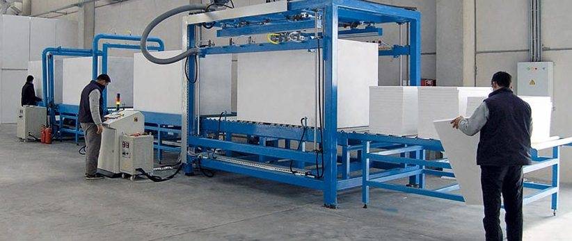 Технология производства пенополистирола состоит во вспенивании гранул сырья в емкости под паровым давлением. Увеличенные гранулы сушатся и спекаются в общую массу в специальных формах под давлением. Полученные блоки выдерживаются от 15 до 30 суток для естественной сушки от влаги, затем режутся на плиты.