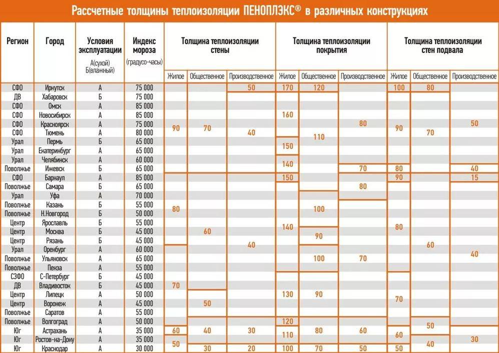 Чем плотнее его структура, чем меньше в ней воздушного пространства, тем толще должен быть пеноплэкс. Чтобы иметь представление о том, как рассчитывать эту толщину, нужно знать другие параметры теплоизоляционного материала. В представленной таблице приведены необходимые сведения.