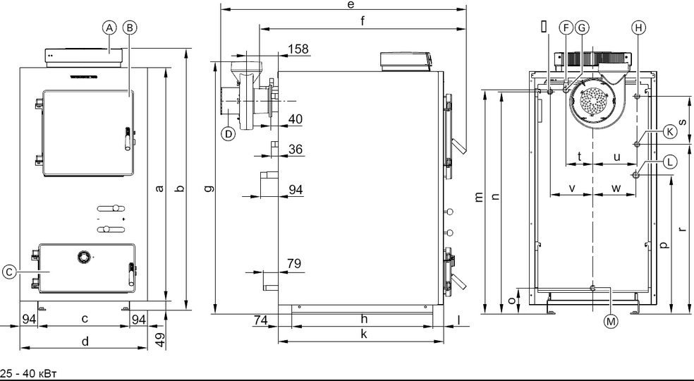 На чертеже представлены размеры котла и обозначения его конструктивных частей. Часть размеров обозначена буквенным кодом — их уточняют по таблице и выбирают по желаемой мощности котла. Эти размеры определены тепловым расчетом, от них зависит правильная и бесперебойная его работа.