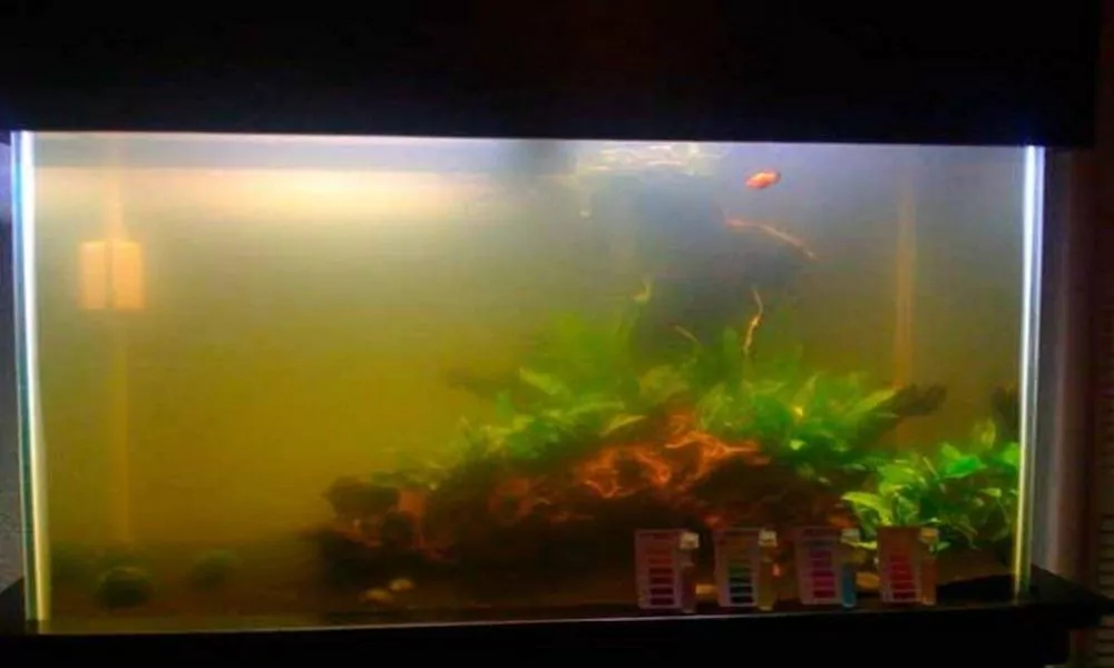 Желтовато-коричневый оттенок воды свидетельствует об использовании кормов ненадлежащего качества, установке декорации из дерева или попросту халатного отношения к гигиене водоёма.