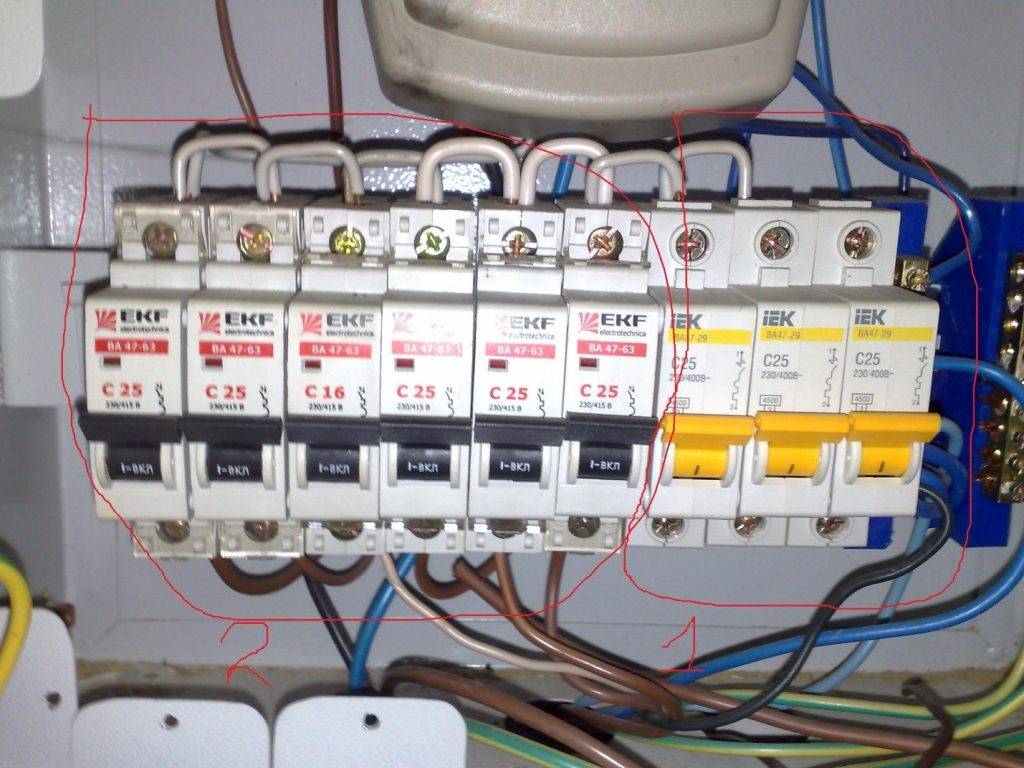 - К фазным и нулевым шинам присоединяется подводящий и питающий кабели, а к слаботочным клеммам – две жилы сигнального провода.
