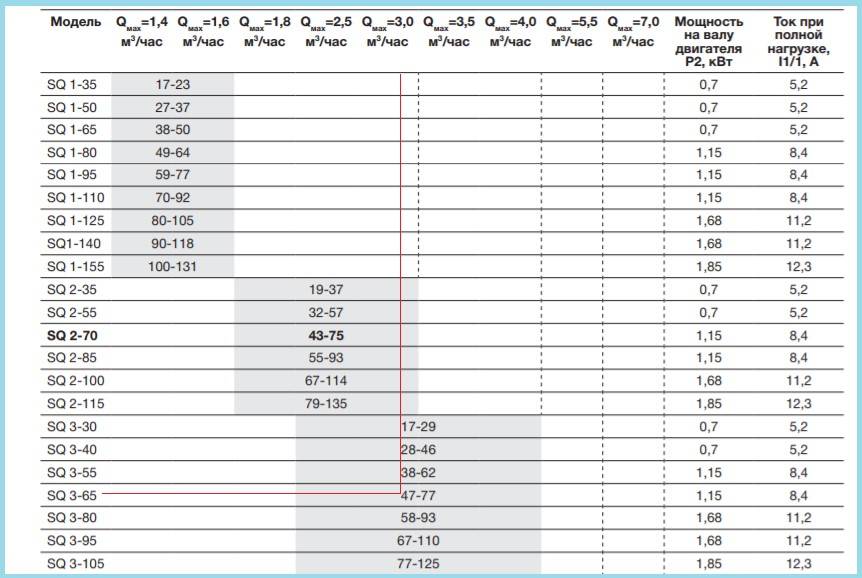 Чтобы определить, какой насос выбирать, воспользуемся, к примеру, таблицей для моделей Grundfos (рис. 12). Из нее видно, что данному напору и объему перекачки наиболее подходит модификация SQ 3-65. При отсутствии подобных таблиц электронасос подбирают по напорным характеристикам и подаче (точка 1 на рис. 13).