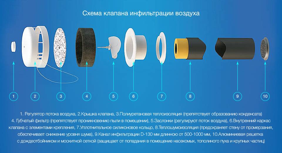 Каждый клапан подобного типа имеет свое универсальное строение. Работа клапана считается эффективной только в том случае, если он пропускает до 30 кубический метров воздуха за 60 минут. Чтобы это осуществлялось, устройство обязательно должно иметь следующее строение:
